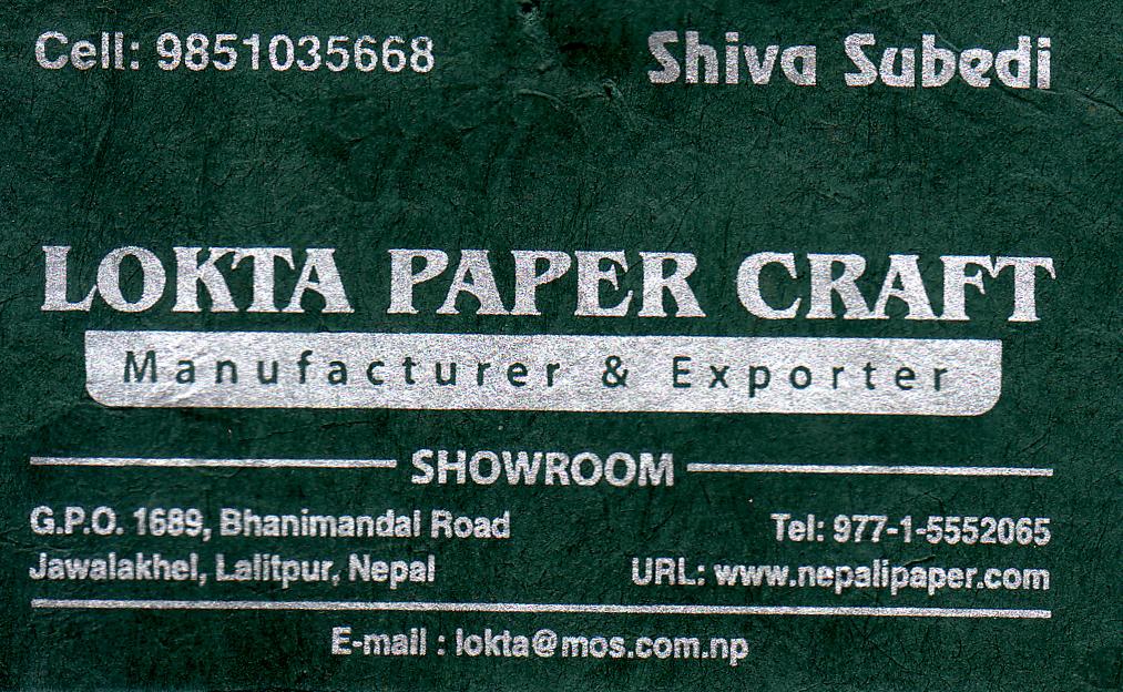 | Description | :We sell handmade nepali paper products We believe in high customer service. Thus, we offer our customer with the finest quality materials in affordable budget and product to match and decor your beautiful life as per your choice. We also offer the delivery. We offer most premium range of Nepali paper crafts. Please remember us if you are looking for the premium range of Nepali paper crafts. You can also visit our shop which is located at Jawalakhel, Lalitpur and can also follow our facebook page CLICK HERE and can order online. |