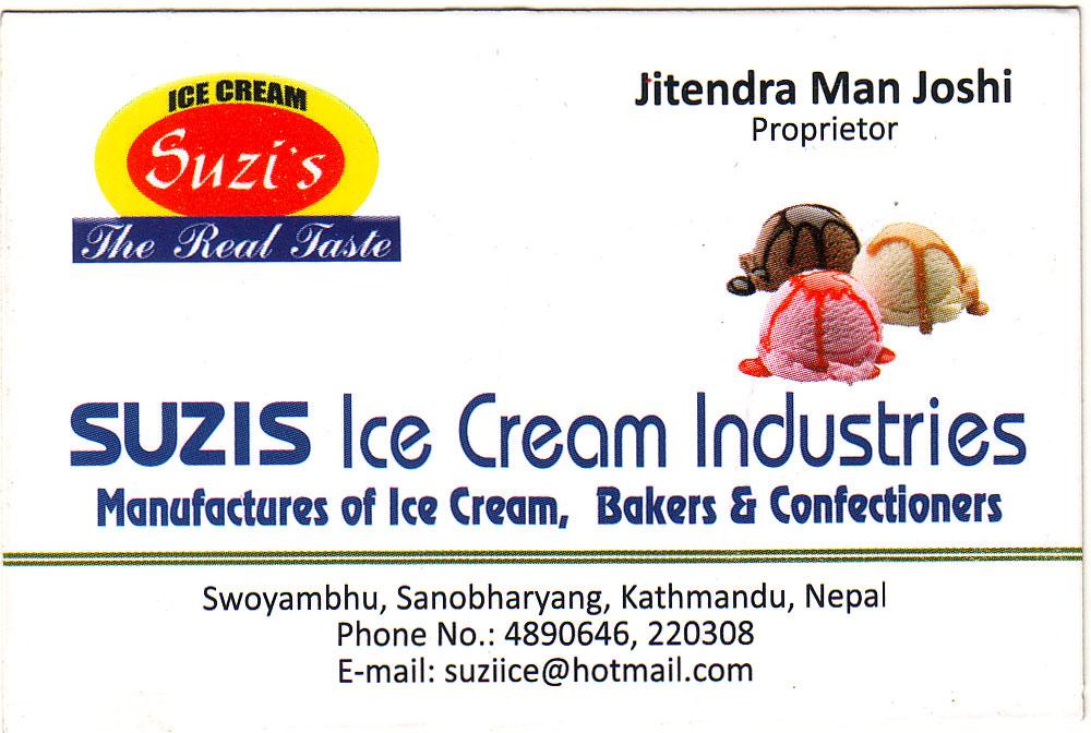 Suzi’s Ice-Cream Industries is a proudly Nepali-owned ice cream manufacturer based in Swayambhu (Sano Bharyang), Kathmandu. Known for its wide variety of delicious frozen treats, Suzi’s offers everything from creamy sundaes and ice-cream bars to unique seasonal flavors like Almond De-Coco and assorted Milky Bars. The company serves both retail and wholesale markets, making its products accessible across Nepal for individual customers, events, and retail shops. With a strong local identity, Suzi’s actively participates in festivals and celebrations, offering special promotions and engaging with its community. Dedicated to quality and customer satisfaction, Suzi’s Ice-Cream Industries continues to be a trusted name in Nepal’s frozen dessert scene. |