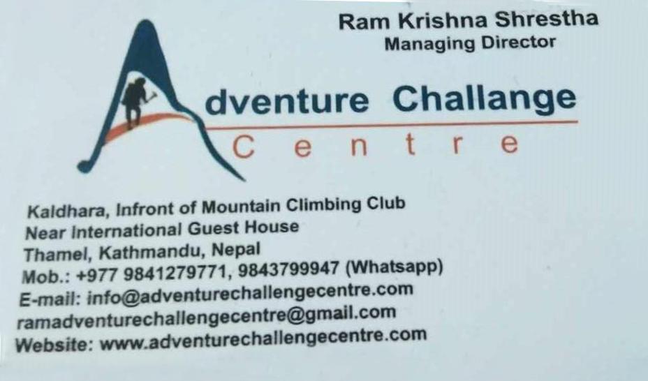 | Description | : Adventure Challenge Centre is a legally registered company under the Nepal government and it is also legal to work all Travel & Tourism connected services in Nepal. We want to welcome all the passionate, Adventure and challenge lovers to come and explore one of the attractive countries and places in the world with a picture-perfect package for your holidays and vacation. As a member of Trekking Agent Association of Nepal (TAAN) and Nepal Tourism Board (NTB). Locally owned and managed, the company was established in 2012 and has a reputation for the dedication and hard work of knowledgeable, friendly and well-experienced staff. |
