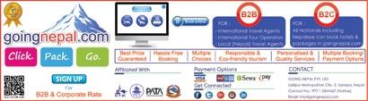 | Description | :Going Nepal Private Limited is registered and fully licensed by government of Nepal as an (Online) Travel Agent (OTA) specially designed to address various requirements of each and every traveler visiting Nepal & neighboring places. Be it a one-night hotel booking in Nepal or just a transfer from International Airport to your hotel, your need is taken care of by professional staffs that are well trained in handling international tourists. Our website; goingnepal.com guarantees that you will get best available prices for your hotel, tour, transfer, air ticket booking or even when you book all inclusive tour packages – competitively priced holiday packages are guaranteed. |