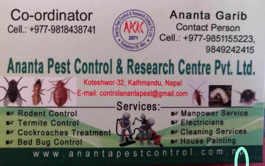 | Description | :Ananta Pest Control & Research entre pvt.ltd. is a pioneer pest control company, which was established in 2071 and we are Govt. Authorize pest controller having licensed issued by pesticide board, ministry of agriculture govt of nepal. We belief in quality and customer satisfaction by giving the training and service procedure to our service team for better service. |