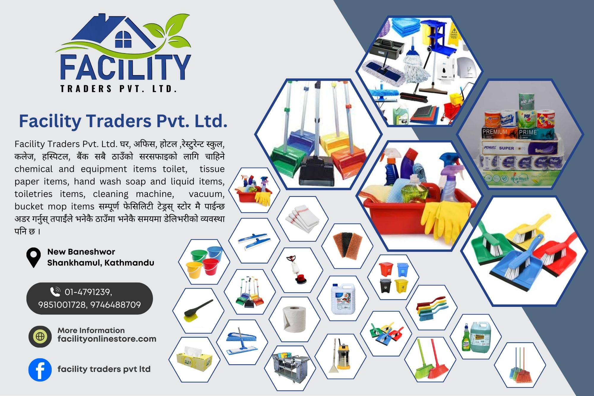 Facility Traders Pvt. Ltd. घर, अफिस, हाेटल ,रेस्टुरेन्ट स्कुल, कलेज, हस्पिटल, बैंक सबै ठाउँको सरसफाइकाे लागि चाहिने chemical and equipment items toilet, tissue paper items, hand wash soap and liquid items, toiletries items, cleaning machine, vacuum, bucket mop items सम्पूर्ण फेसिलिटी टेड्रस् स्टाेर मै पाईन्छ अडर गर्नुस् तपाईंले भनेकै ठाउँमा भनेकै समयमा डेलिभरीकाे व्यवस्था पनि छ ।