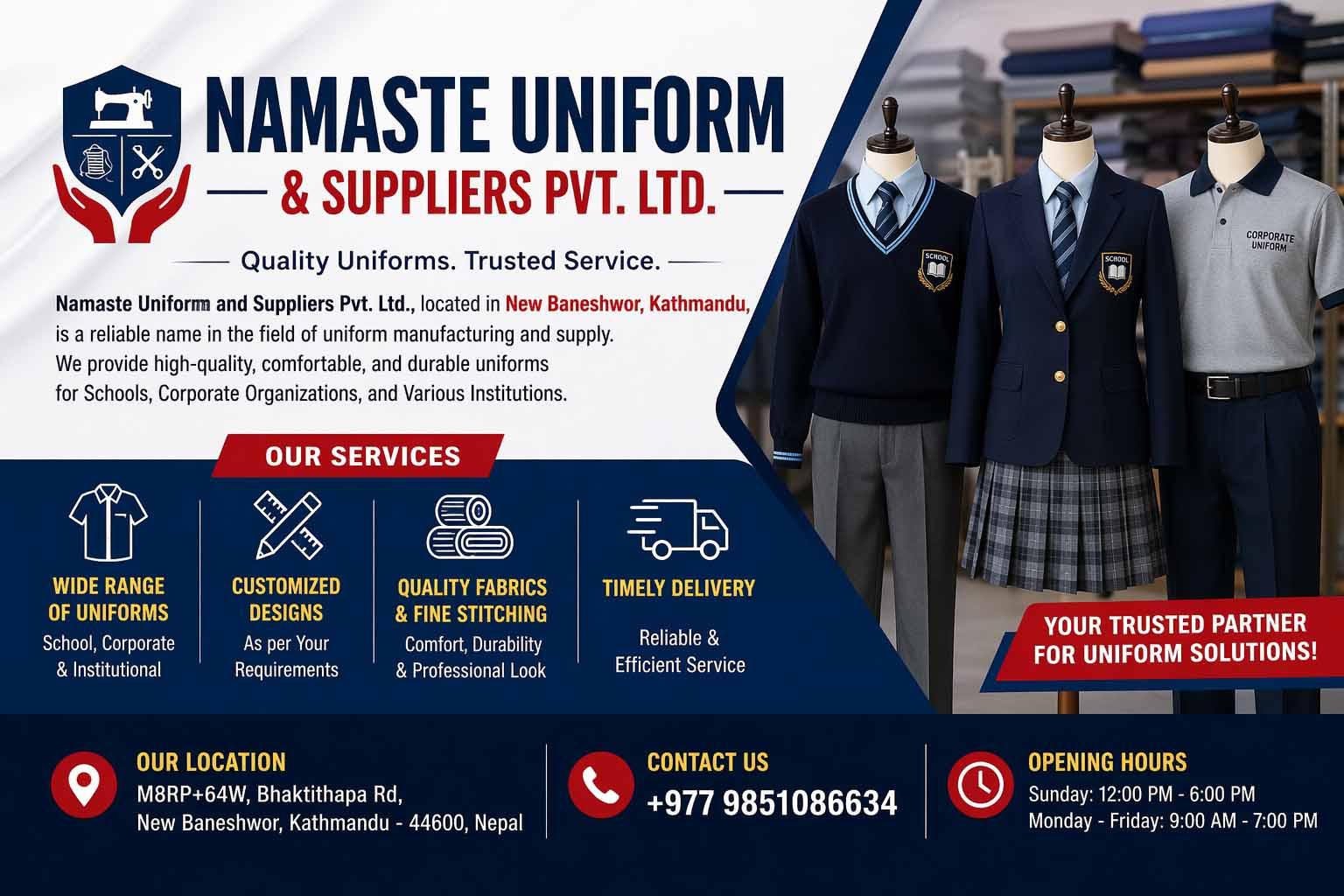 Namaste Uniform and Suppliers Pvt. Ltd., located in New Baneshwor, Kathmandu, is a trusted provider of high-quality uniforms and garment solutions for schools, corporate organizations, and various institutions. The company specializes in designing, tailoring, and supplying a wide range of uniforms, ensuring durability, comfort, and professional appearance. With a focus on customer satisfaction, they offer customized designs, quality fabrics, and timely delivery to meet the specific needs of clients. Known for their reliable service and attention to detail, Namaste Uniform and Suppliers has built a strong reputation as a dependable partner for uniform supply in the Kathmandu area. |