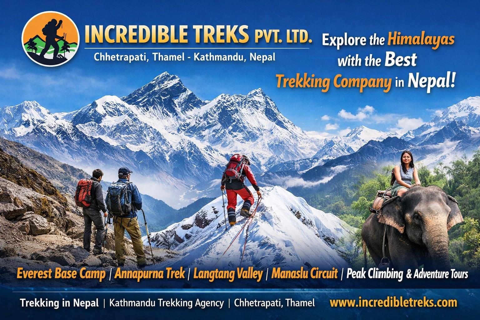 Incredible Treks Pvt. Ltd. is a well-established trekking and adventure travel company located in Chhetrapati, Thamel, Kathmandu, Nepal, offering a wide range of trekking, tour, and mountaineering services across the majestic Himalayas. The company specializes in popular trekking routes such as Everest Base Camp Trek, Annapurna Base Camp Trek, Langtang Valley Trek, and Manaslu Circuit Trek, along with peak climbing, expedition management, cultural tours, jungle safaris, and customized holiday packages. With a team of experienced guides, professional mountaineers, and dedicated travel planners, Incredible Treks Pvt. Ltd. is committed to providing safe, reliable, and memorable travel experiences tailored to the needs of every traveler. Known for its excellent customer service, attention to detail, and deep knowledge of Nepal’s geography and culture, the company ensures a seamless and enriching adventure for both beginners and experienced trekkers. For those searching for a trusted trekking agency in Thamel or planning an unforgettable Himalayan journey, Incredible Treks Pvt. Ltd. is a dependable choice. SEO Keywords: trekking in Nepal, Nepal trekking agency, trekking company in Thamel, Everest Base Camp trek, Annapurna Base Camp trek, Langtang Valley trek, Manaslu Circuit trek, peak climbing Nepal, adventure tours Nepal, Kathmandu trekking company, Chhetrapati trekking agency, Nepal tour packages, Himalayan trekking, best trekking company in Nepal. |
