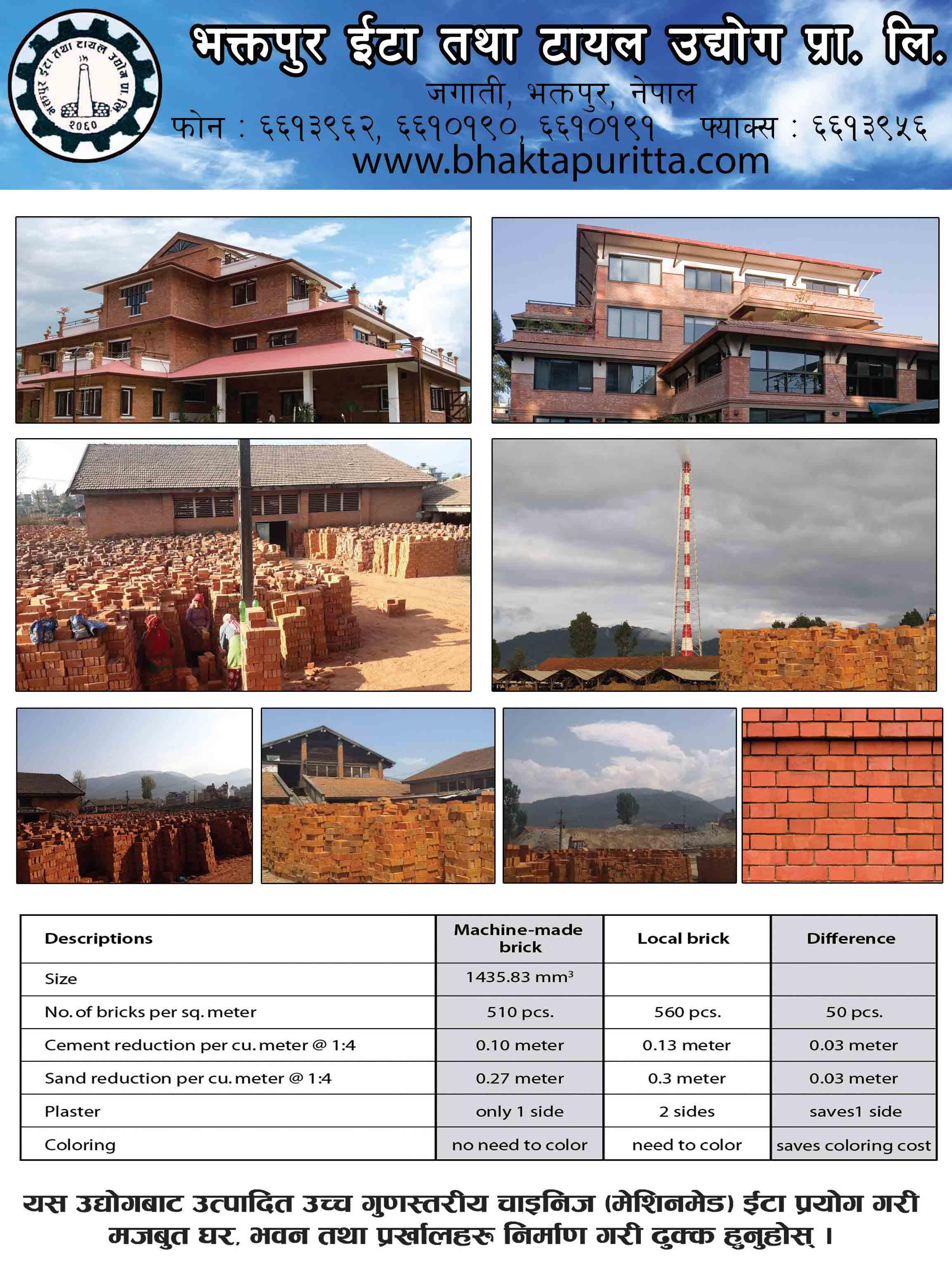 | Description | :We offer quality Normal Machine Made Brick (Chinese Brick) & Machine Made Frog Brick in Nepal backed up by skilled technical support and excellent customer service. दुक्क हुनुहोस् ।यस उद्योगबाट उत्पादित उच्च गुणस्तरीय चाइनिज ईटा प्रयोग गरौ मजबुत घर भवन तथा प्रखालहरु निर्माण गरी दुक्क हुनुहोस् । |