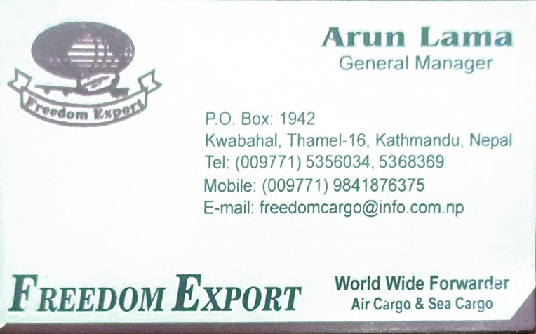 Freedom Export, based in the heart of Thamel, Kathmandu, is a reputable company specializing in the export of high-quality products from Nepal to international markets. Committed to excellence and customer satisfaction, the company focuses on delivering authentic Nepali goods, including handicrafts, textiles, and artisanal items, with strict attention to quality and ethical sourcing. With a dedicated team and extensive knowledge of global trade practices, Freedom Export ensures seamless international transactions, timely deliveries, and reliable service. Their mission is to promote Nepalese craftsmanship worldwide while fostering sustainable business relationships with partners across the globe. |