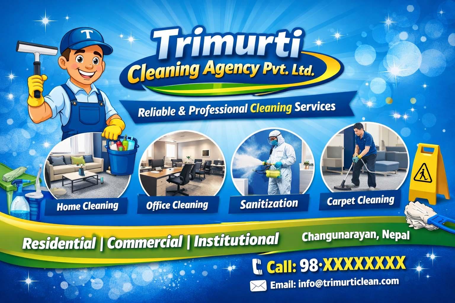 Trimurti Cleaning Agency Pvt. Ltd. is a professional cleaning and facility services provider operating in and around the Changunarayan area of Nepal. The company offers a range of cleaning solutions for residential, commercial, and institutional clients, including routine housekeeping, deep cleaning, sanitation, waste removal, and maintenance support. With a focus on reliable service, thorough cleanliness, and customer satisfaction, Trimurti Cleaning Agency aims to maintain hygienic spaces for homes, offices, and other facilities, helping clients save time and ensure healthier living and work environments.
